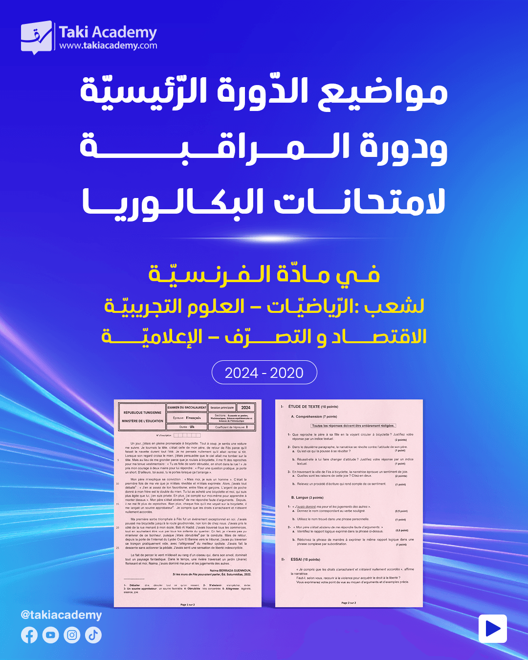 إليكم مختلف الدروس والمحاور التي سجلت حضورها في امتحان مادة الفرنسية في مختلف الدورات السابقة للبكالوريا من سنة وإلى غاية فرصتك الآن لتتعرف على أبرز مواضيع الامتحانات السابقة وتكتشف أهم ما جاء في سابق الدورات ...